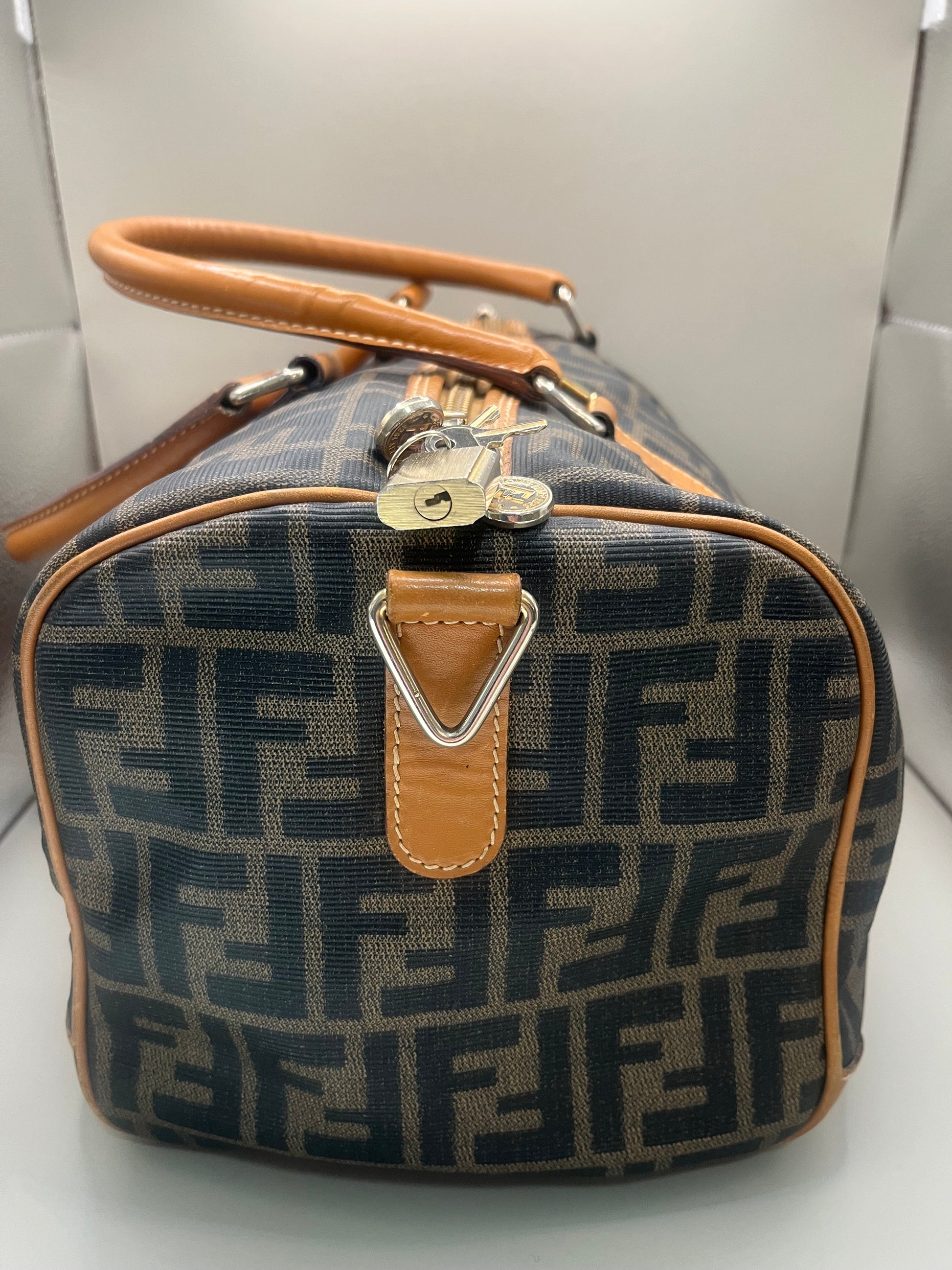 Authentic Vintage Fendi Zucca "Boston" Canvas & Leather Top Handle Bag, Made in Italy