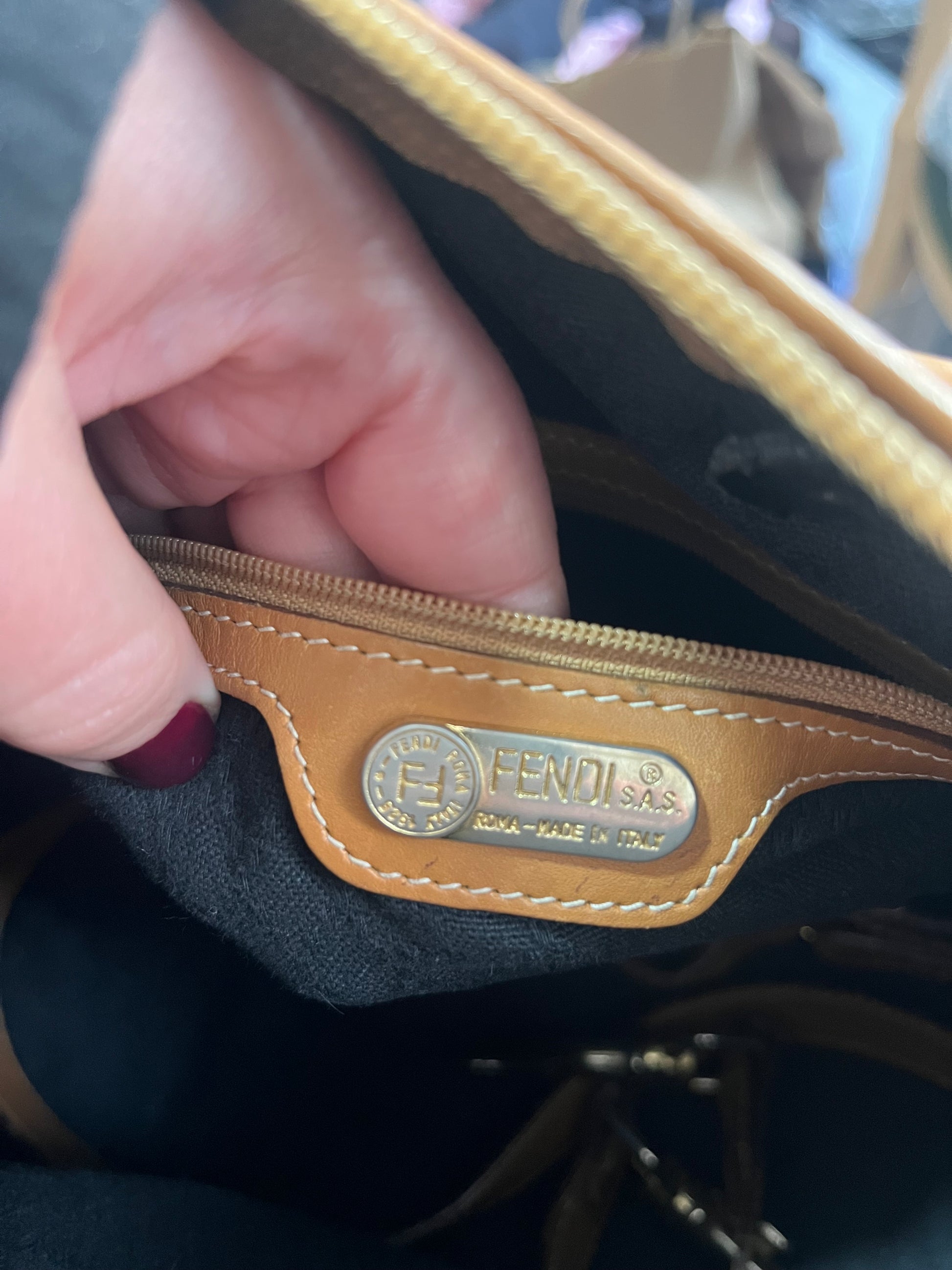 • Hardware: Gold-tone metal, embossed with Fendi branding.